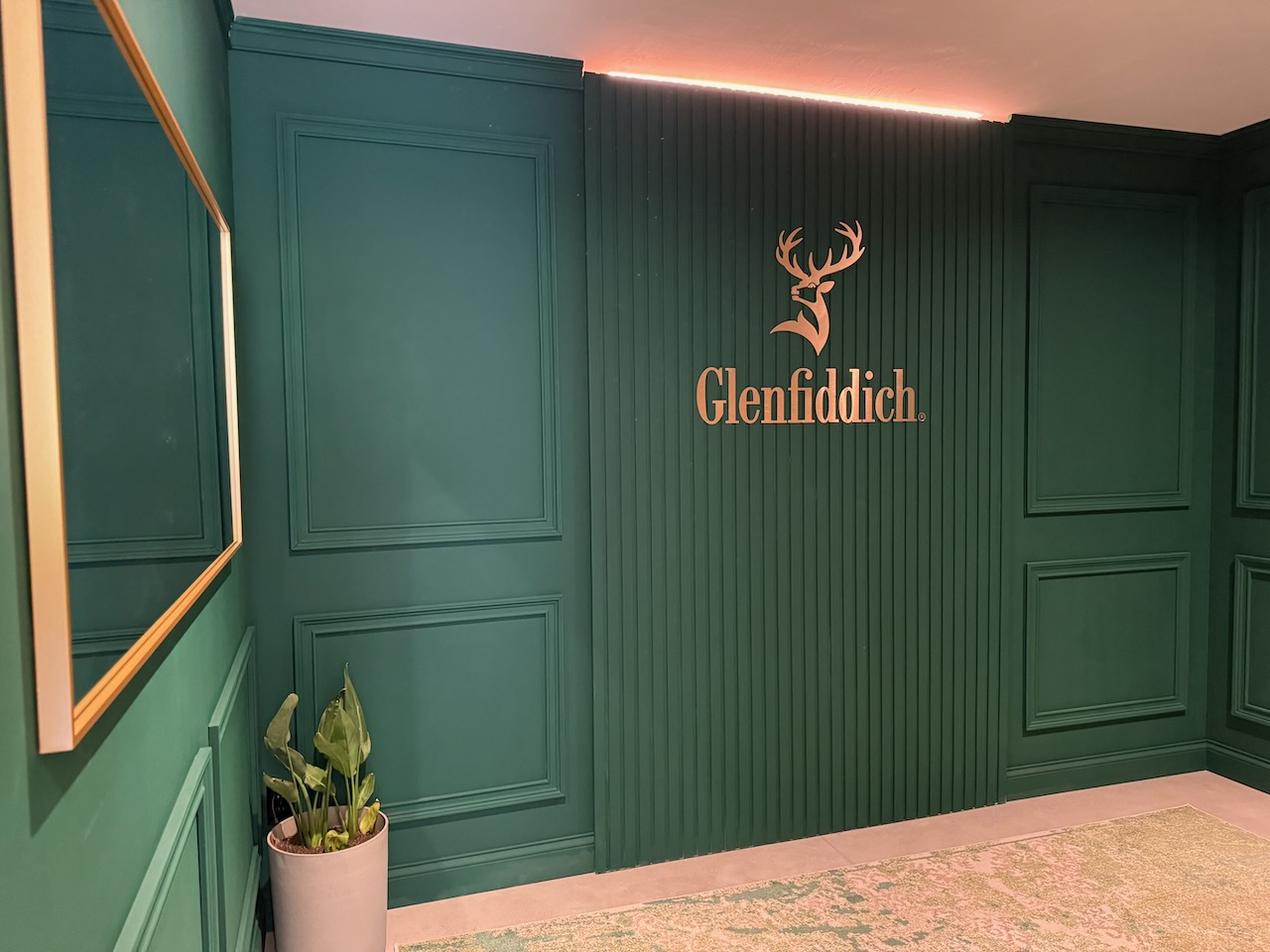 Tractor Vision delivered a fully immersive Glenfiddich experience, transforming the space into a multi-layered brand environment that blended luxury finishes, interactive tasting zones, and striking visual details. The centerpiece included a series of gold-textured feature walls with dimensional logos in white acrylic and brushed bronze laminate, creating a cohesive and elegant backdrop. A custom bar and backwall showcased green-painted counters, ribbed finishes, LED-lit shelving, and push-through polished gold logos, designed to highlight product displays and elevate the tasting experience. The tasting room featured four walls with detailed moulding, wainscoting, chair rails, picture-frame panels, mirrors, and wood shelving, combining classic craftsmanship with contemporary brand aesthetics. Four large platforms with faux-cement finishes were installed across varying elevations, while an L-shaped wooden deck with walnut-stained planks and integrated steps provided functional flow and elevated display surfaces. Additional walls were fabricated to conceal back-of-house areas, kitchenettes, and service zones, ensuring a polished and seamless environment. Reception areas included custom entry kiosks with black paint finishes and vinyl graphics, while on-site adjustments included bridging walls, roof coverings, custom flooring, and re-fabricated dimensional signage. Frosted and mirrored vinyl accents, alongside RGBW LED lighting, added depth and sophistication to the brand world. Across a crew of ten over multiple days, Tractor Vision fabricated, delivered, installed, and refined the full environment, accommodating live change orders and final material selections to bring Glenfiddich’s vision to life in a seamless, elevated, and fully branded experience.